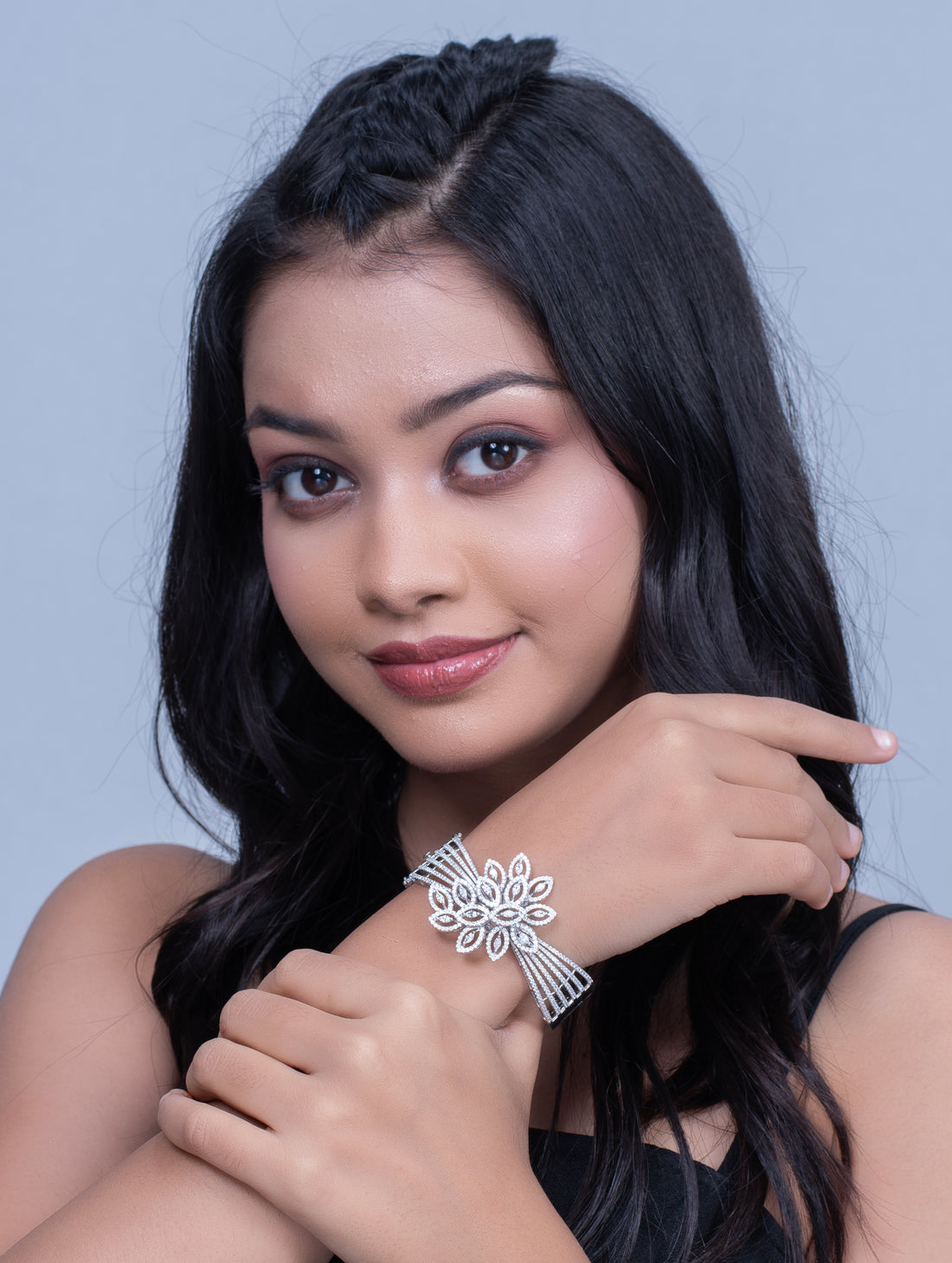 This elegant bracelet showcases a beautifully crafted floral centerpiece, encrusted with shimmering white Swarovski zircon...