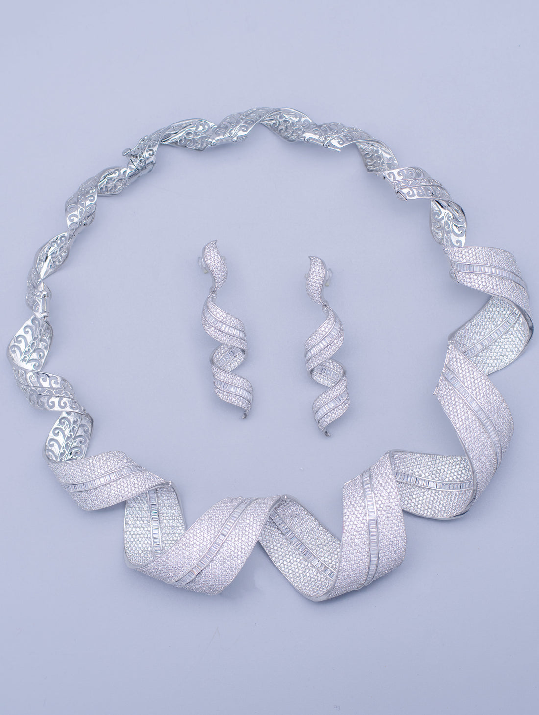 Product Code: KSNKL000300 This stunning silver necklace set, paired with delicate silver earrings, captures the...
