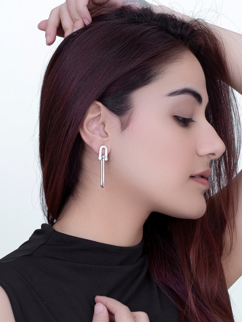 Minimal elegance redefined These stylish and sophisticated silver earrings, adorned with dazzling details, are perfect for adding a subtle sparkle to your everyday look or special occasions.