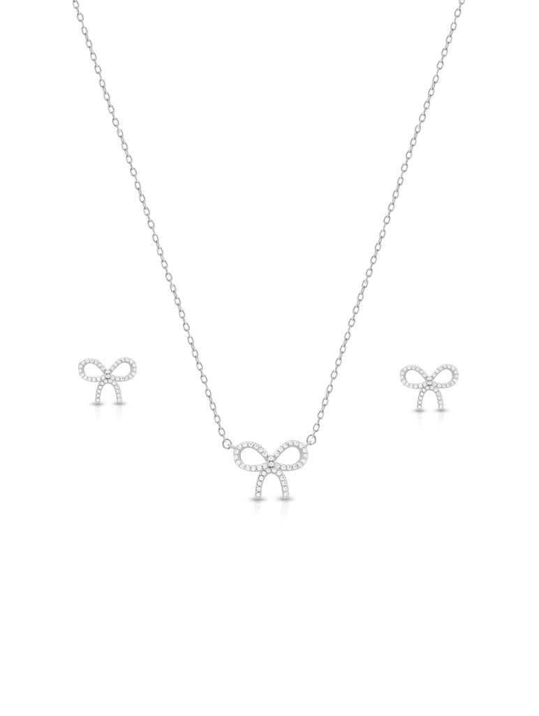 Adorn yourself with this elegant Bow Design Silver Chain and Stud Earrings Set, crafted to perfection for a graceful and feminine appeal. The dainty chain necklace and matching stud earrings feature sparkling bow motifs encrusted with fine white Swarovski zircon stones. The elegant simplicity of the bow design, paired with the subtle shimmer of the stones, makes this set a versatile choice—perfect for everyday elegance or adding sophistication to special occasions.