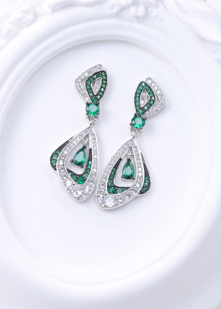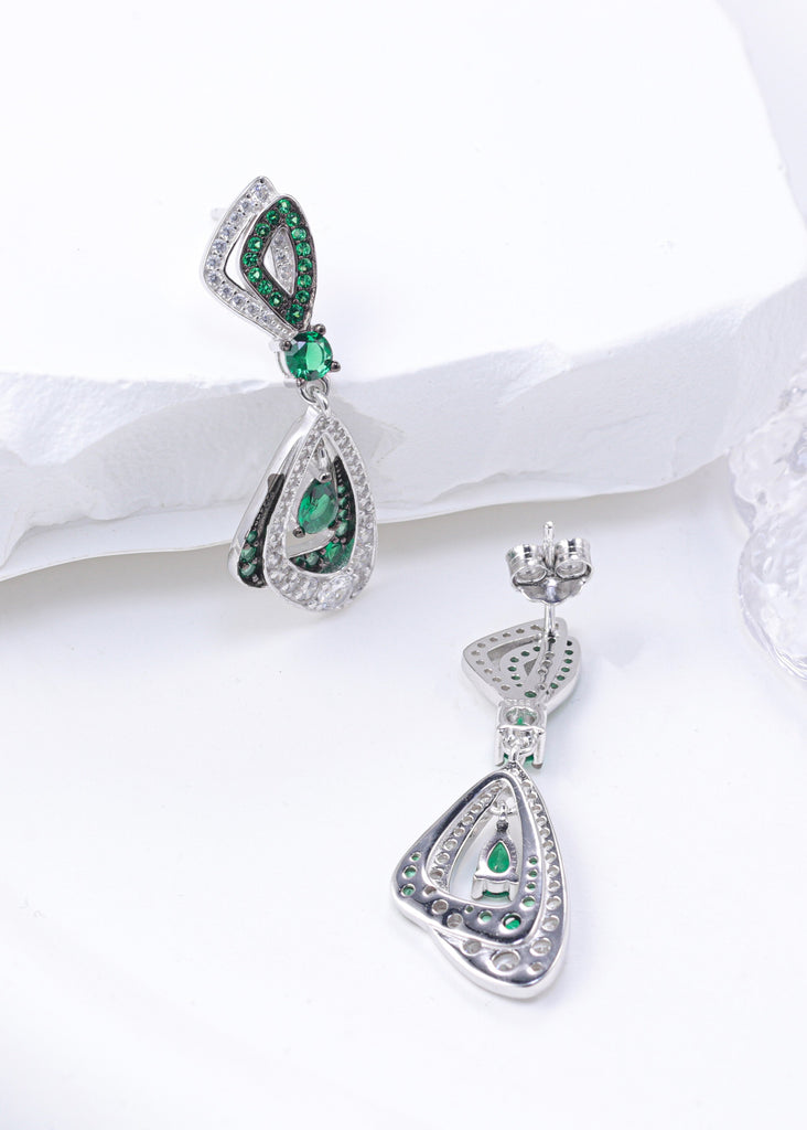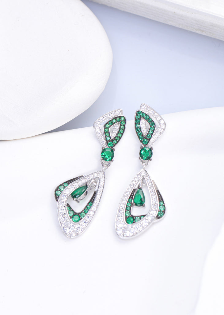 Enhance your style with our sterling silver earrings, showcasing vibrant green emerald stones encircled by dazzling white zircons. These stunning earrings blend classic elegance with contemporary flair, making them an ideal choice for any occasion.