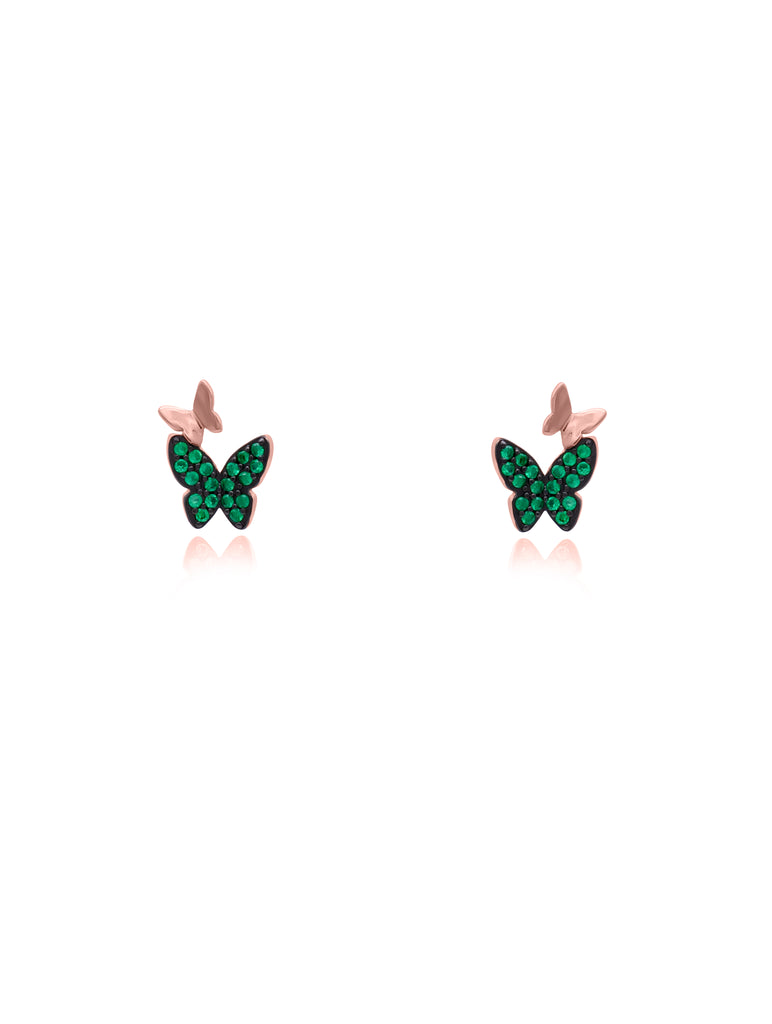 Elegantly crafted in rose gold, these two-butterfly earrings are adorned with a vivid green semi-precious stone that adds a refreshing pop of color. The graceful butterfly motif symbolizes beauty and transformation, while the warm rose gold tone enhances the design’s natural charm.