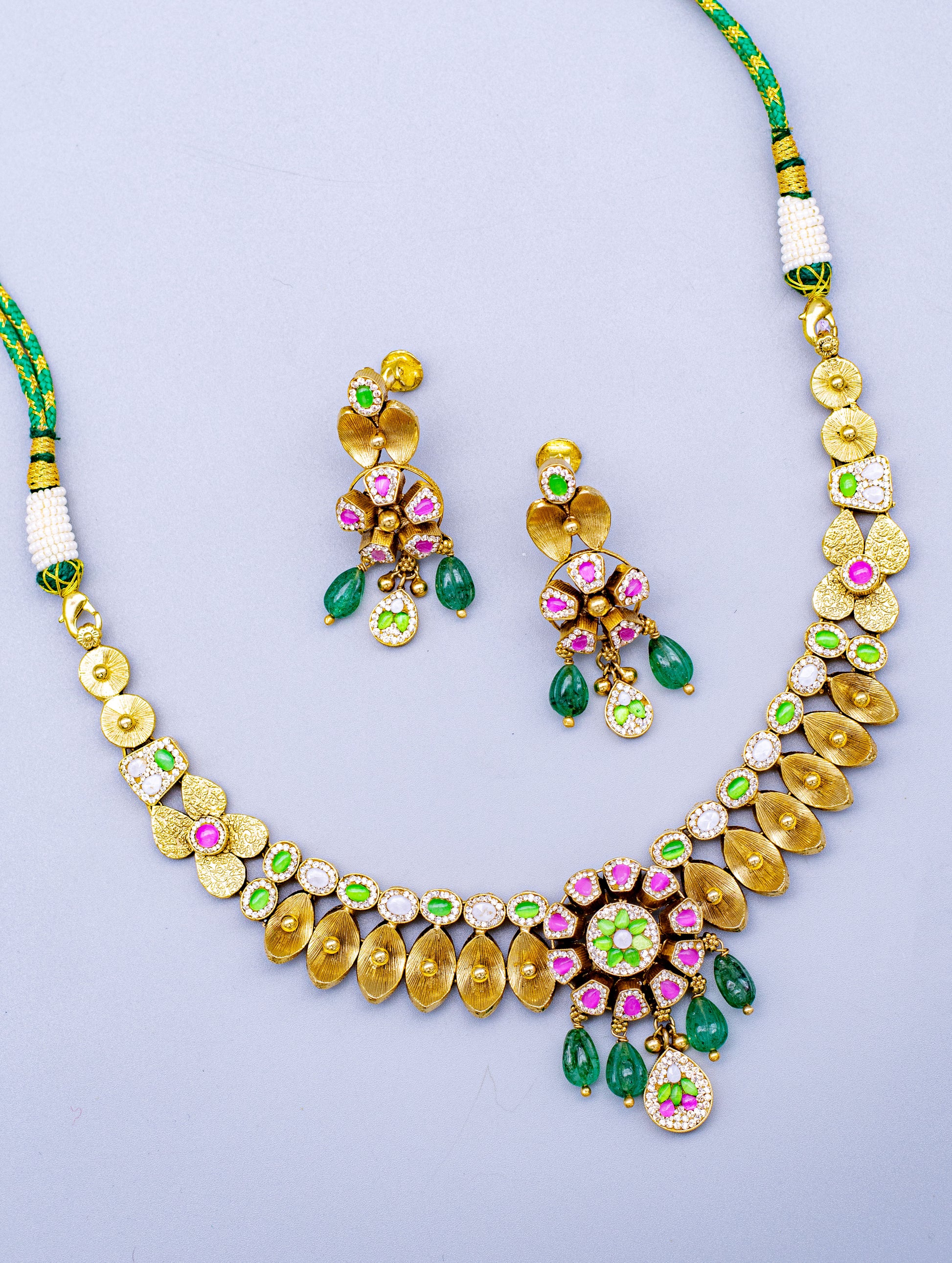 This stunning gold polish short necklace set with matching earrings is a perfect blend of elegance and color. Paired with complementary earrings, the set exudes sophistication, making it an ideal accessory for both casual and formal occasions. Whether you're dressing up for a special event or adding a touch of glamour to your everyday look, this beautiful jewelry set will effortlessly elevate your style.