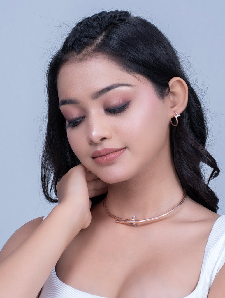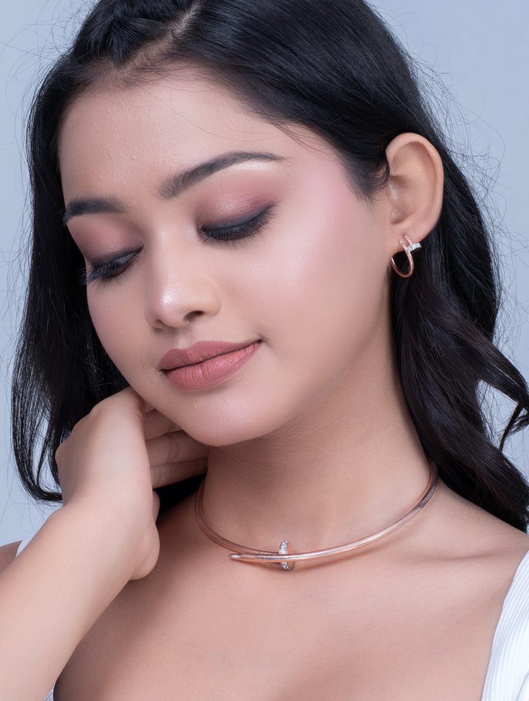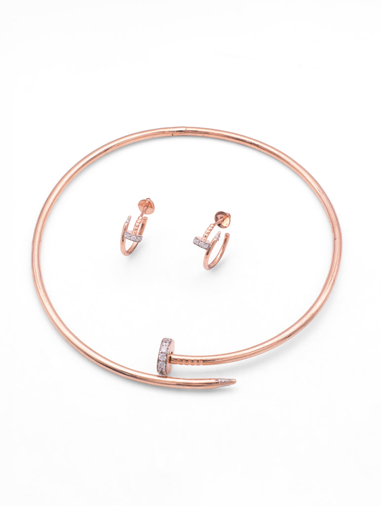 This modern jewelry set features a sleek rose gold-tone bangle and matching hoop earrings, designed to resemble twisted nails—a contemporary and iconic motif in jewelry design. The ends of both the bangle and earrings are accented with sparkling white Swarovski zircon stones, adding elegance and shimmer to the minimalist form. Perfect for stylish, modern looks and statement ensembles.