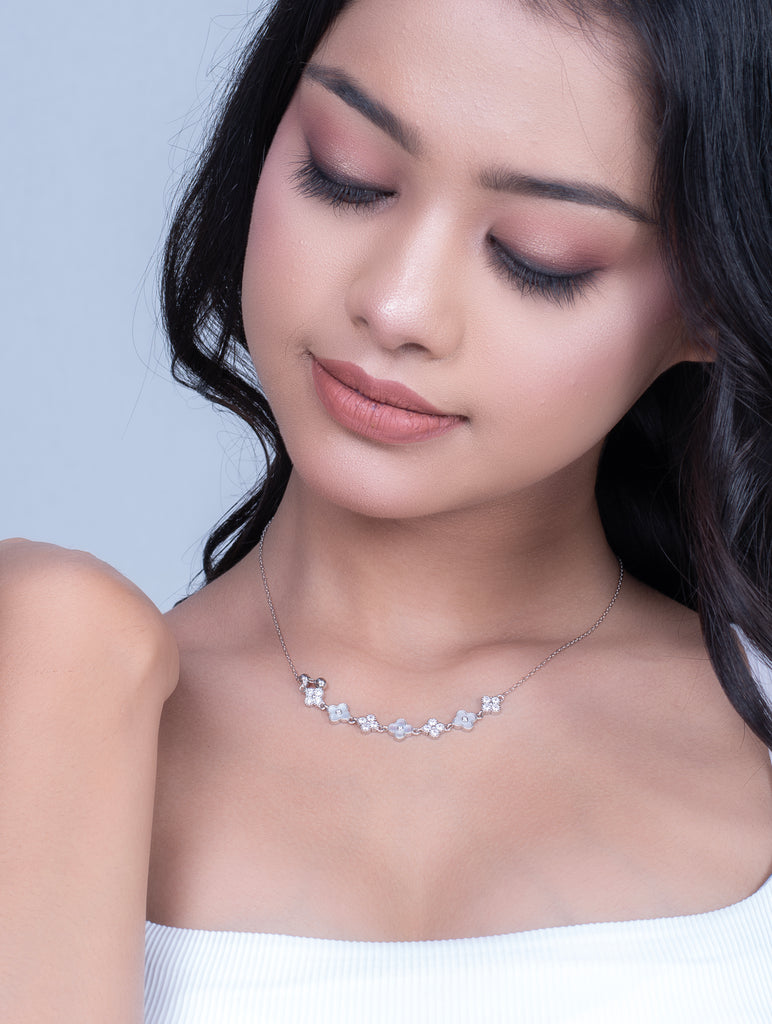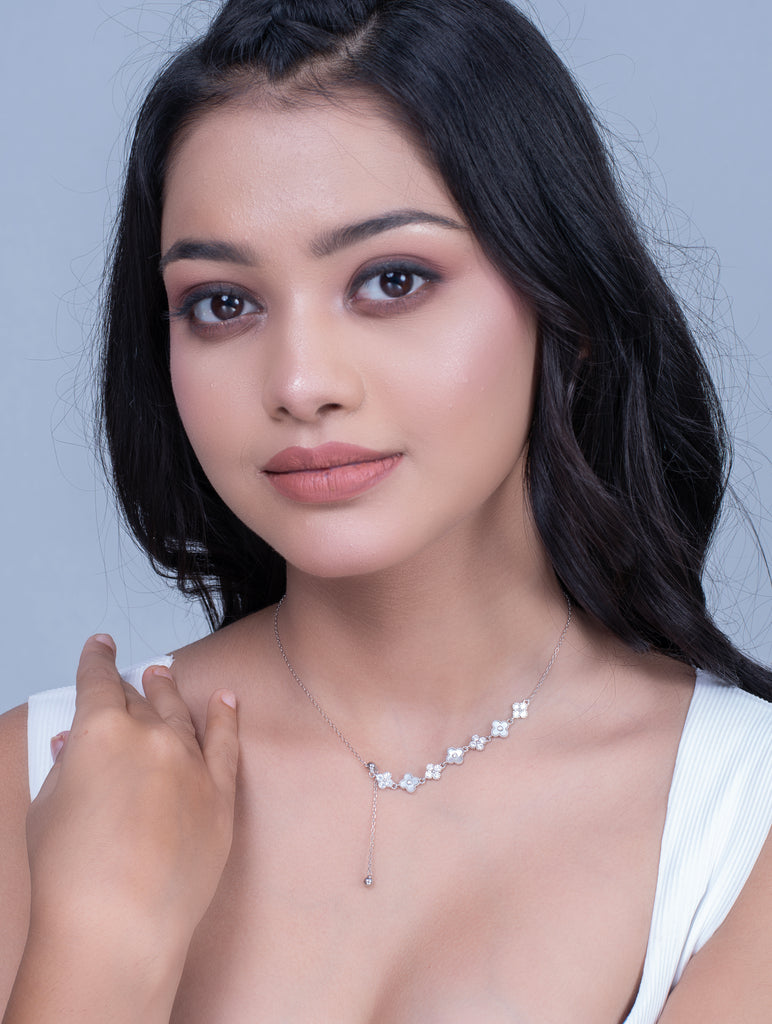 Floral & Clover Motif Silver Necklace with Swarovski Zircon