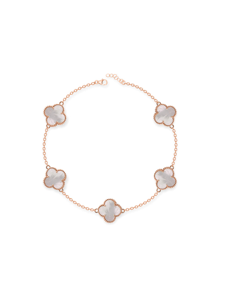 This refined bracelet features five four-leaf clover-shaped charms, each beautifully inlaid with lustrous mother-of-pearl and bordered by a delicate beaded edge for a timeless, sophisticated look. The design is enhanced with a fine gold-tone chain and secured with a classic lobster clasp. With its adjustable fit and elegant detailing, this bracelet is a symbol of luck and style, perfect for both everyday wear and special occasions.