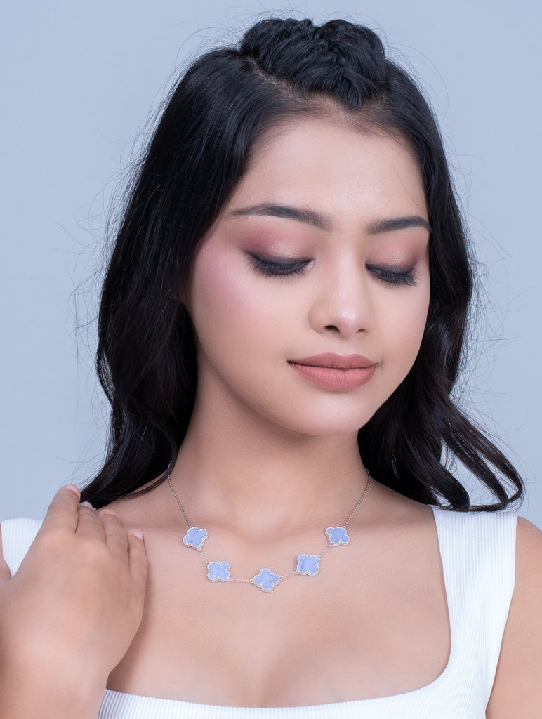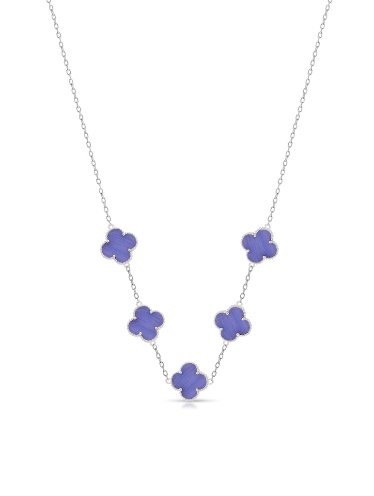 This elegant necklace features a fine silver chain adorned with six clover-shaped charms, each finished in a beautiful lavender purple enamel. The glossy enamel surface is enhanced by delicate silver beaded borders, adding sophistication and subtle texture to the design. Stylish yet graceful, this necklace brings a fresh and contemporary charm, making it a perfect accessory for both everyday wear and special occasions.