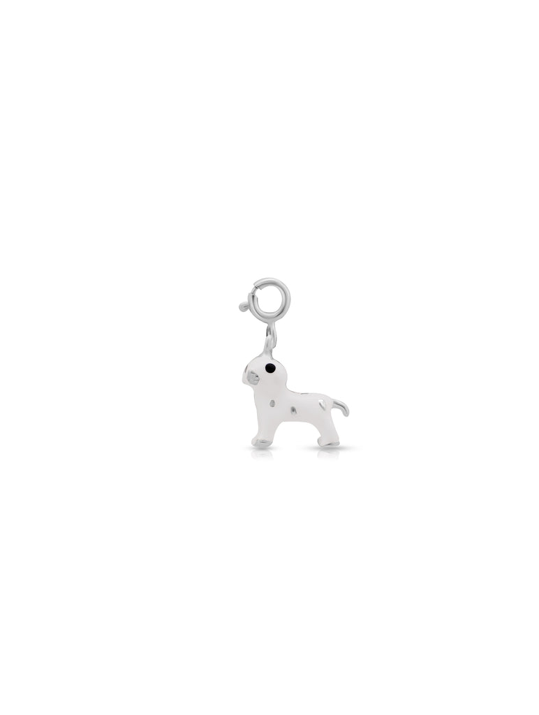 This whimsical pendant is crafted in white enamel with delicate silver accents, featuring a small pointed horn and a subtle tail. Black dots create expressive eyes and charming detailing, giving the piece a playful, magical appearance. The small loop at the top allows for easy attachment to any necklace or bracelet, making it a delightful accessory for everyday wear or gifting.