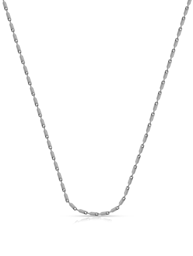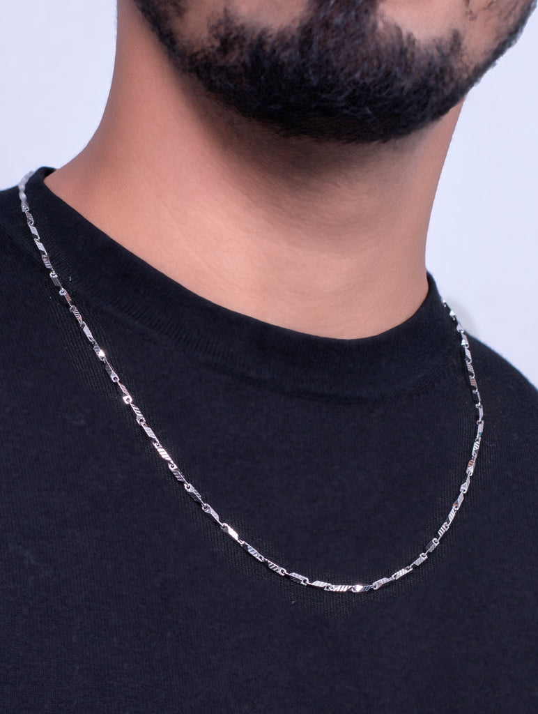 This sleek gents chain features uniquely shaped, angular links connected in a precise pattern, giving the piece a distinct geometric style. The polished silver finish enhances its contemporary and understated elegance. With a minimalist design, this chain is perfect for both casual and formal wear, allowing it to be worn solo for a subtle statement or layered with other pieces for a fashionable layered look.