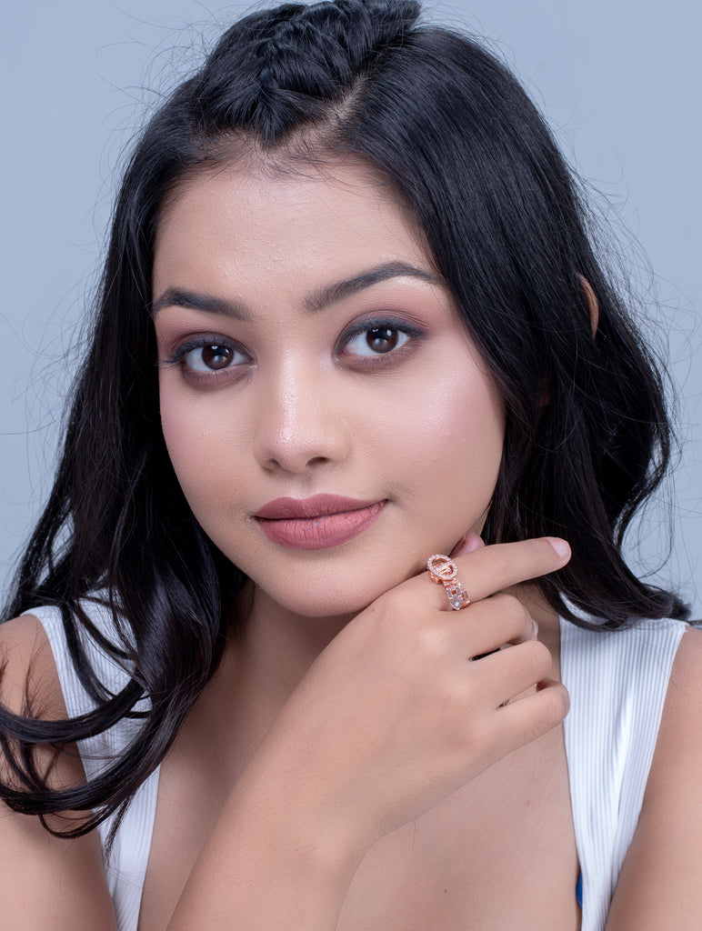 This bold and contemporary ring features a unique chain-link band design, creating a modern and stylish look. The centerpiece showcases an oval-shaped motif encrusted with sparkling white Swarovski zircon stones, accented by a prominent vertical bar for a striking geometric effect. The adjustable design ensures a comfortable fit, making it a perfect statement accessory for any occasion.