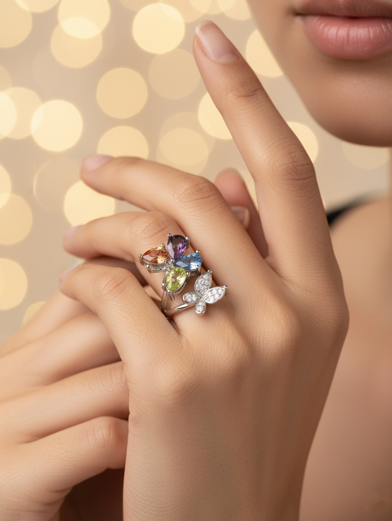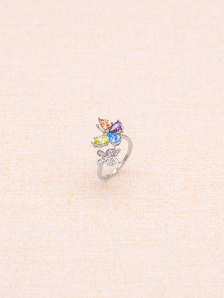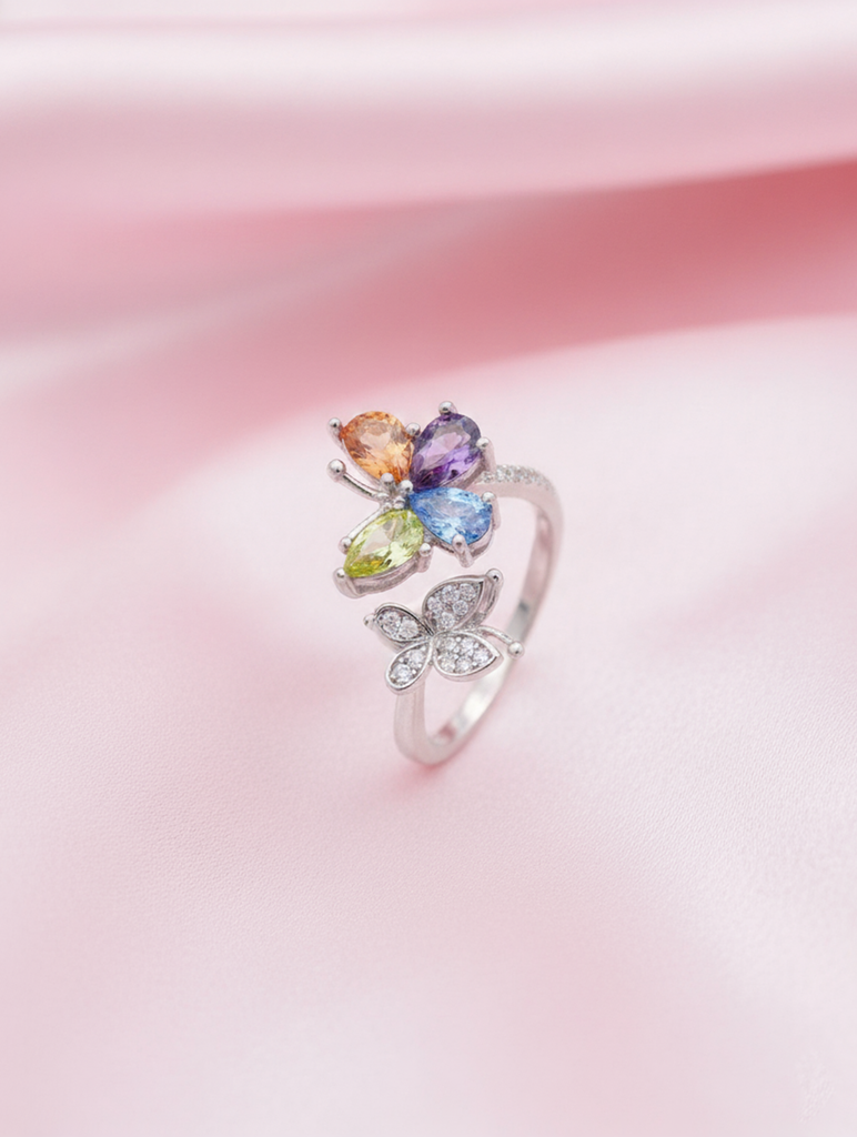 This exquisite sterling silver ring features a dazzling white Swarovski zircon paired with a vibrant semi-precious colored stone, creating a striking balance between brilliance and charm. A timeless piece that radiates elegance, it’s perfect for adding a refined touch to both everyday wear and special occasions.