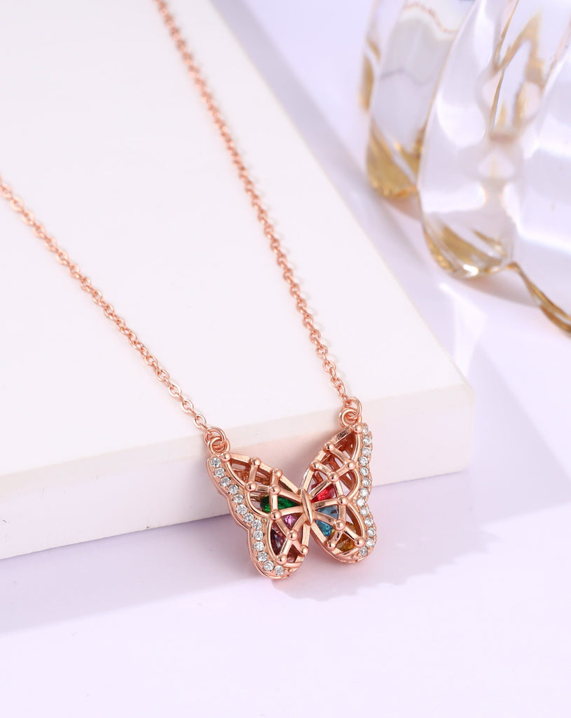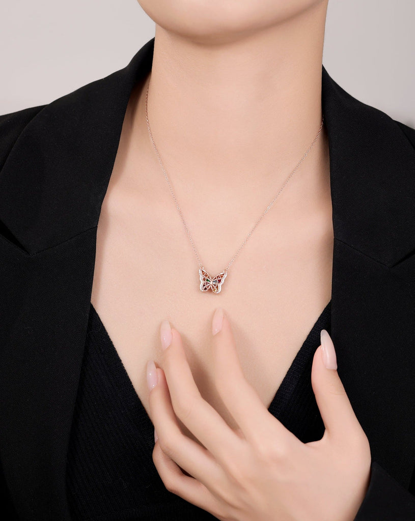 A rose gold chain with a butterfly pendant set within a net pattern, adorned with colorful stones, would make for a stunning and unique piece of jewelry. The net pattern adds intricacy and depth to the piece, creating visual interest and texture. The colorful stones further enhance the overall aesthetic, adding pops of vibrant hues and sparkle.
