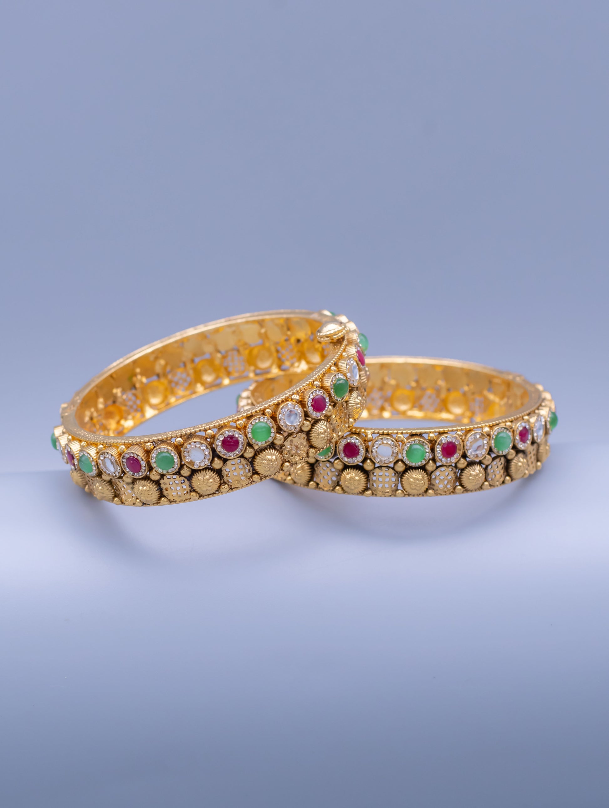 These stunning gold-polished stone-studded silver bangles blend classic charm with modern sophistication. Perfect for every occasion, they add a touch of luxury to your ensemble.