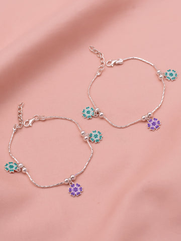 This elegant sterling silver anklet features a delicate textured chain adorned with three floral enamel charms—two in soothing aqua blue and one in a vibrant purple. Accented with polished silver beads for added detail, this piece strikes the perfect balance between playful charm and timeless sophistication. A graceful accessory designed to complement both casual and festive looks.