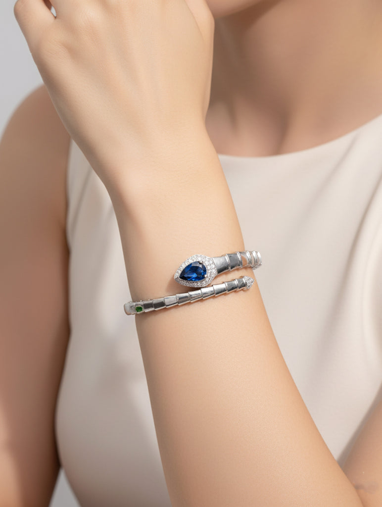 This stunning openable kada bracelet is crafted from premium 925 sterling silver and adorned with sparkling white Swarovski zircon stones, beautifully complemented by a striking blue stone at the center. The contrasting hues create a captivating focal point that exudes elegance and sophistication. Designed with an openable clasp for a comfortable and effortless fit, this bracelet shimmers with every movement, adding a touch of grace and glamour to any occasion. Perfect for festive celebrations, parties, or elegant evening wear, this exquisite piece showcases the timeless artistry of KinniSoni fine jewellery.