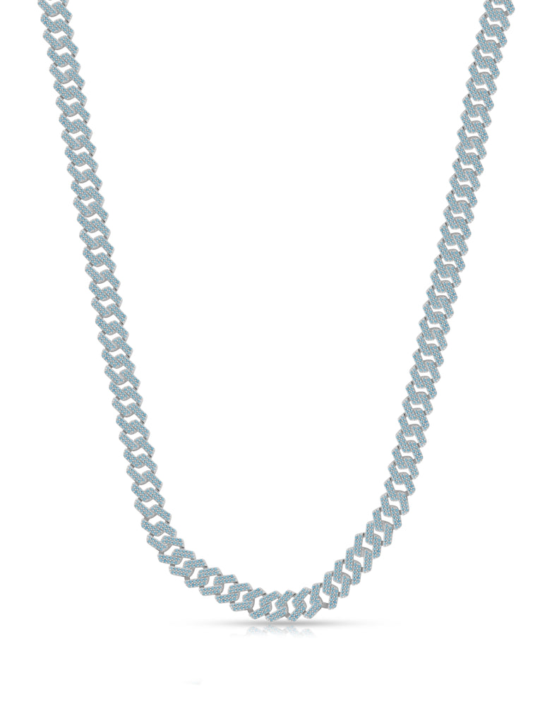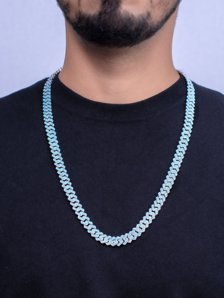 This bold gents chain is crafted with large, interlocking links in a classic Cuban/curb chain design. Each link is fully encrusted with light blue Swarovski zircon stones, creating a dazzling shimmer and eye-catching effect throughout the piece. With its vibrant sparkle and substantial size, this chain is a true statement accessory—perfect for men who want to showcase glamour, confidence, and contemporary style.