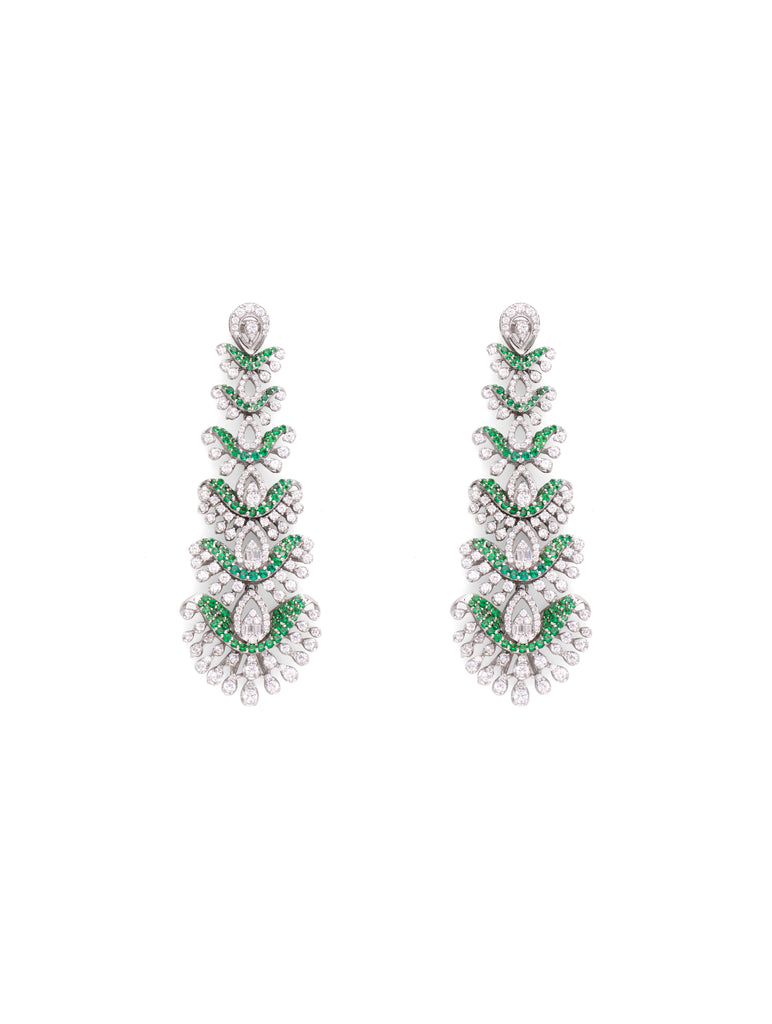 These exquisite statement earrings from KinniSoni are a true embodiment of luxury and elegance. Crafted in 925 sterling silver, the earrings feature a breathtaking combination of vibrant green and sparkling white Swarovski zircon stones, intricately arranged in an ornate pattern. Their bold, oversized design exudes opulence, making them the perfect accessory to elevate any festive or bridal ensemble. Each stone is meticulously handset to reflect light beautifully from every angle, creating a radiant sparkle that captures attention effortlessly. Ideal for weddings, festive occasions, or grand celebrations, these earrings are designed to make you shine with timeless sophistication.