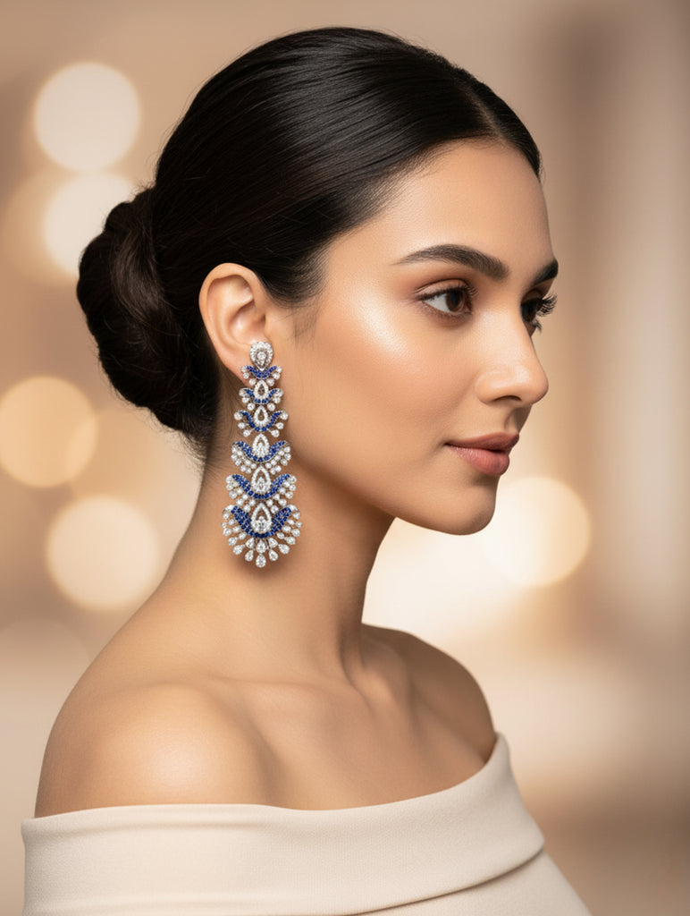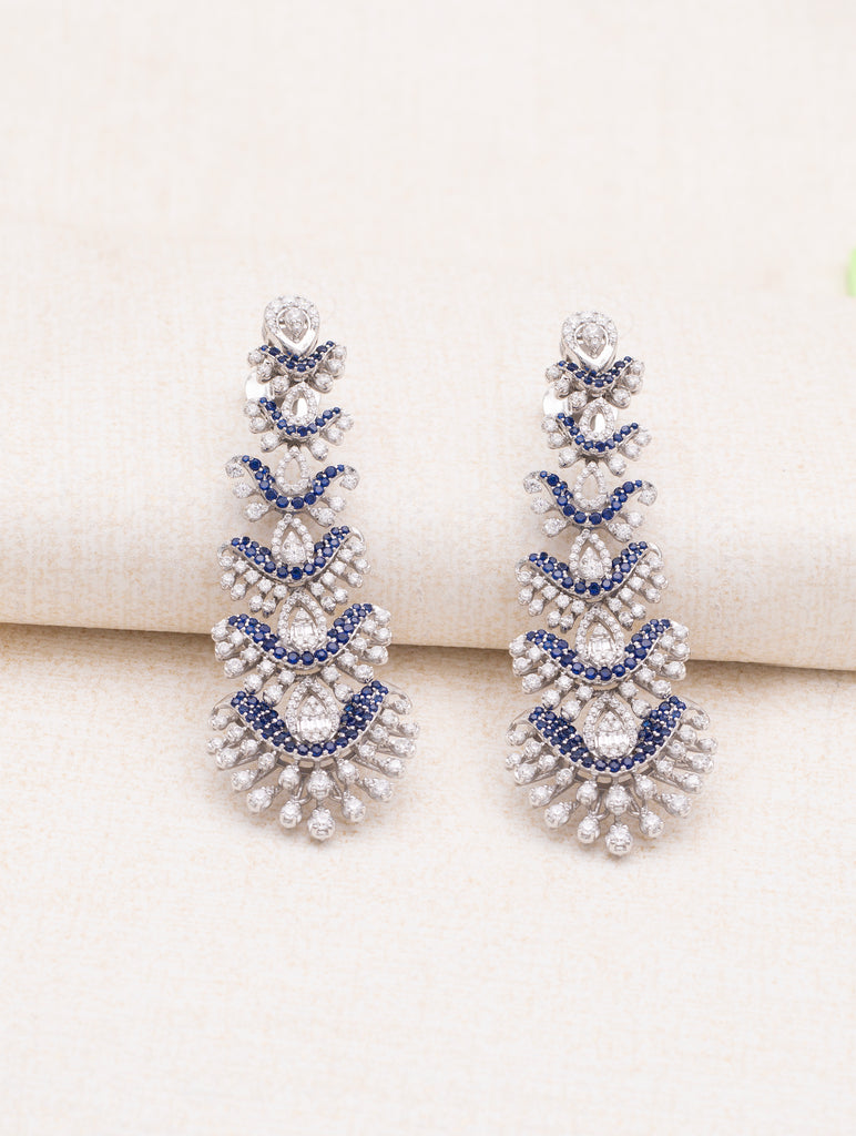 Make a breathtaking statement with these elegant drop earrings, masterfully crafted from 925 sterling silver and designed to exude timeless sophistication. The delicate filigree pattern showcases exceptional craftsmanship, while the sparkling white Swarovski zircons and deep blue stones add a touch of regal charm. The cascading silhouette creates graceful movement and a radiant sparkle, making these earrings the perfect choice for weddings, festive celebrations, or elegant evening wear.