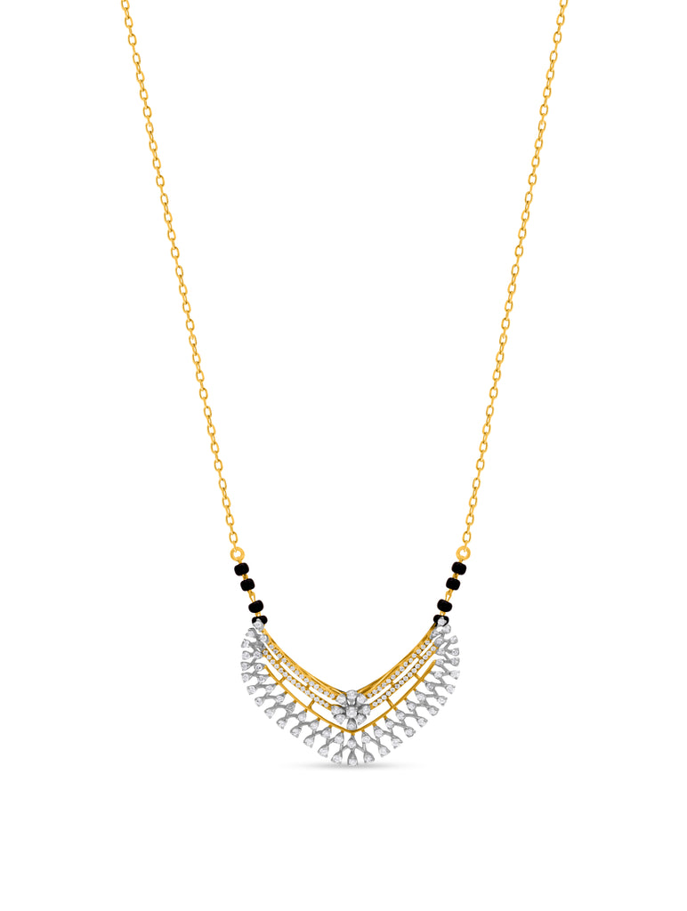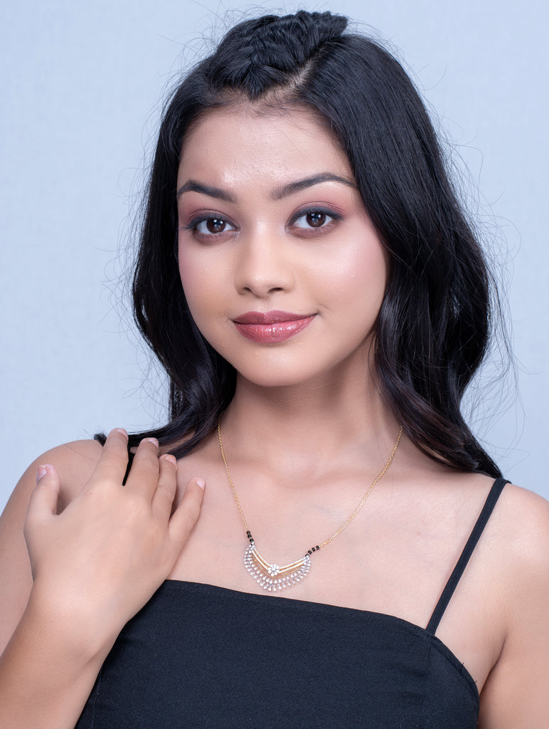 This exquisite mangalsutra features a gold-toned chain accented with symmetrical sets of black beads near the pendant, a classic hallmark of traditional mangalsutra jewelry in Indian culture. The centerpiece showcases an ornate fan-shaped design layered with three curved rows of sparkling white Swarovski zircon stones and gold bands. Dangling stone drops and a central floral cluster add elegance and an eye-catching effect, making this necklace perfect for festive occasions and special celebrations.