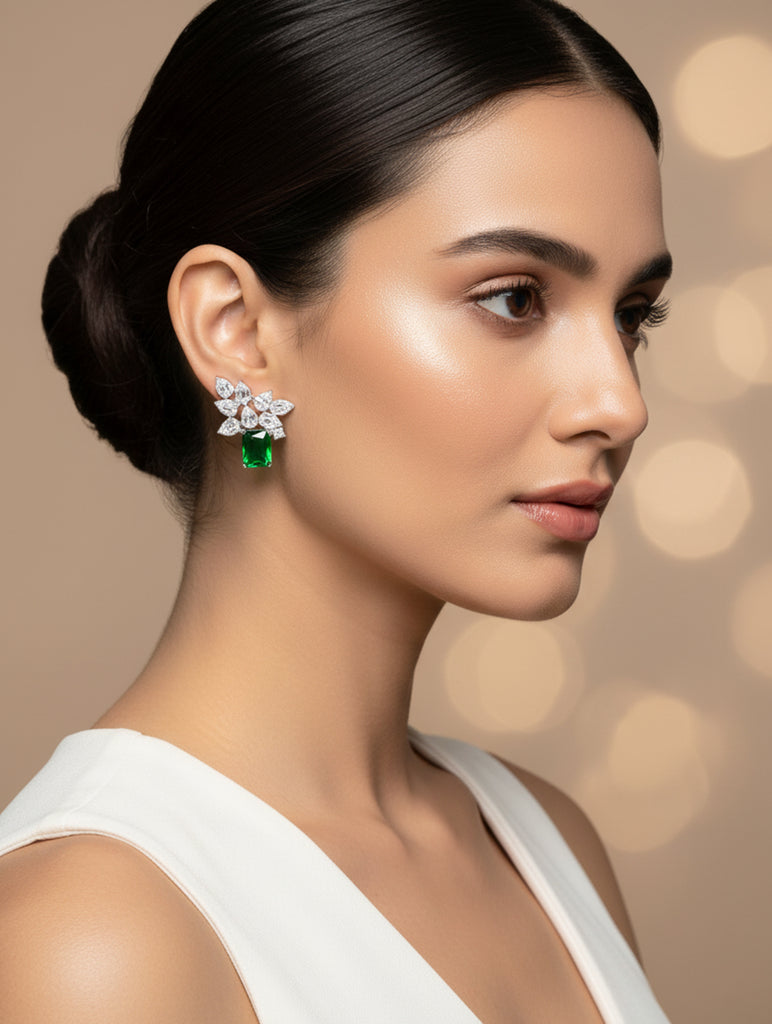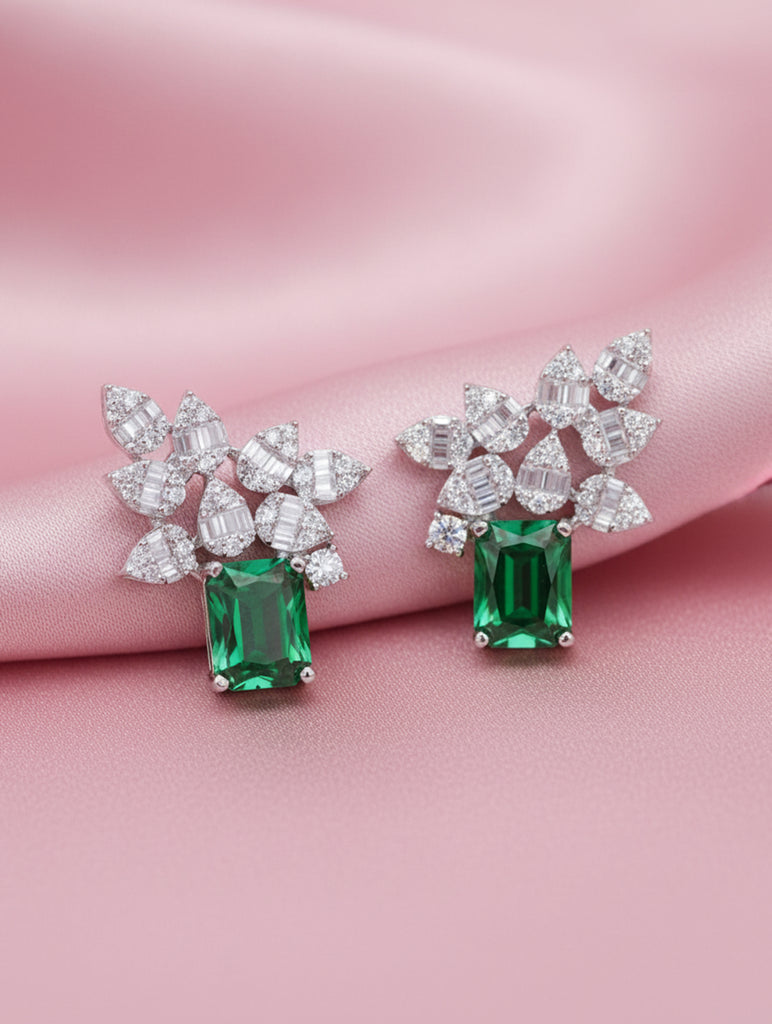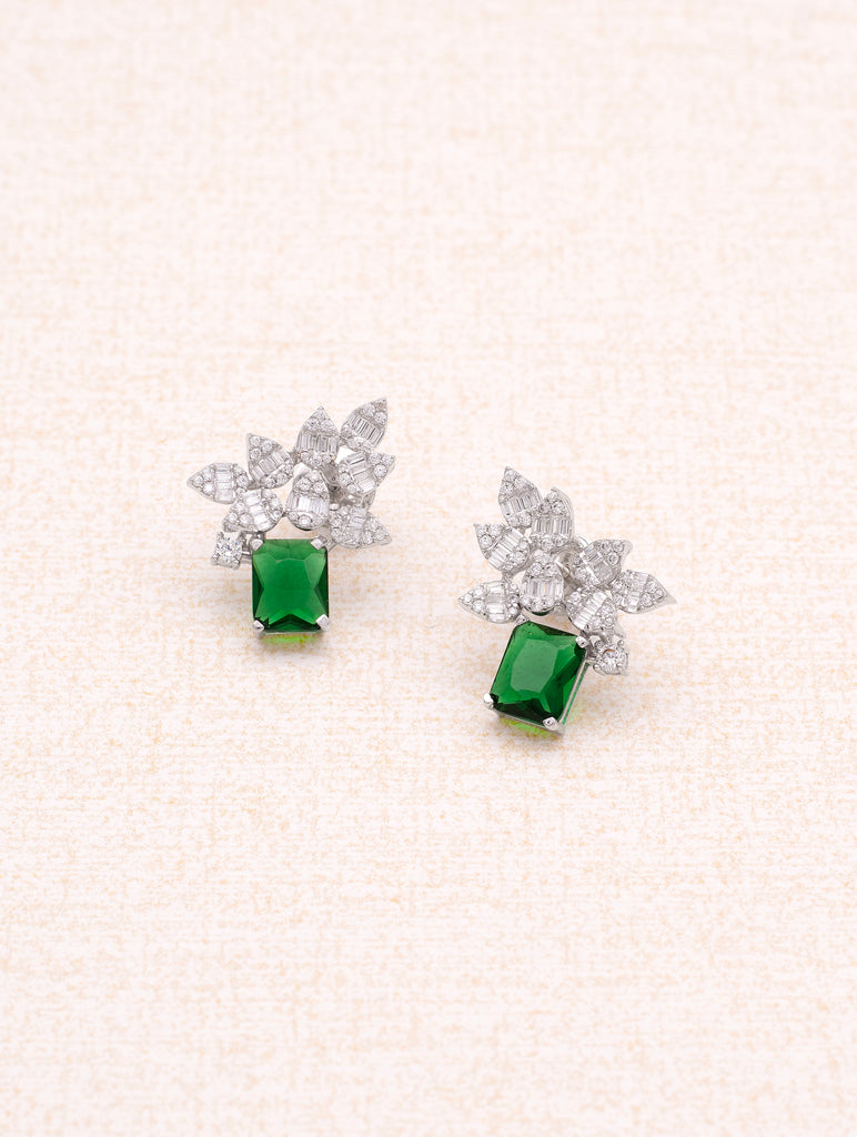 Leaf Elegance 925 Silver White & Green Stone Stud Earrings