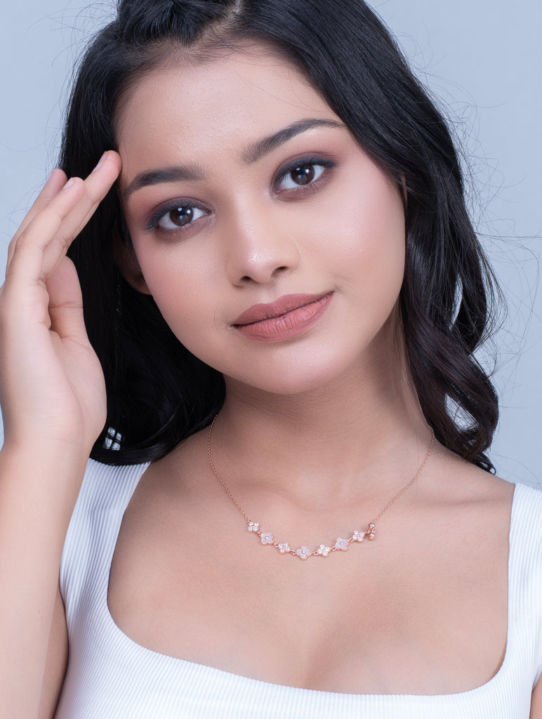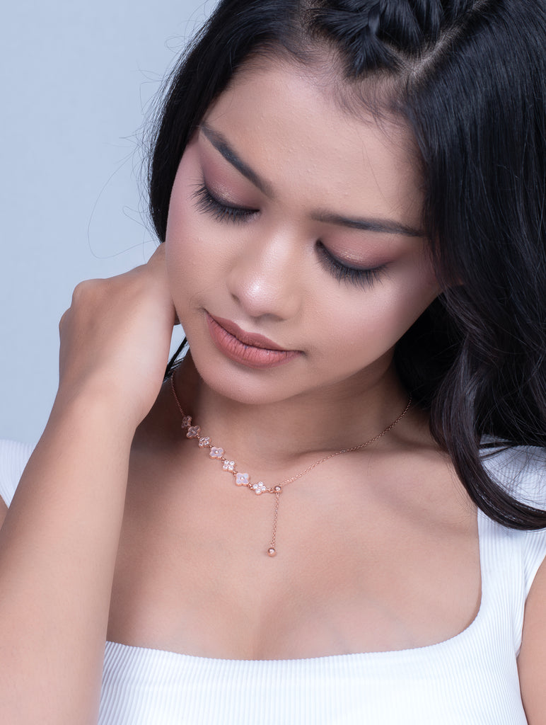 This delicate necklace features a series of alternating floral motifs—some adorned with sparkling white Swarovski zircon stones and others filled with soft pink enamel interiors—linked together to create a charming centerpiece. The adjustable chain with a polished ball accent adds a sleek, modern touch, making it versatile for layering or wearing solo. With its dainty floral elements and soft color palette, this necklace blends romance and contemporary style, perfect for enhancing any outfit with elegance and charm.