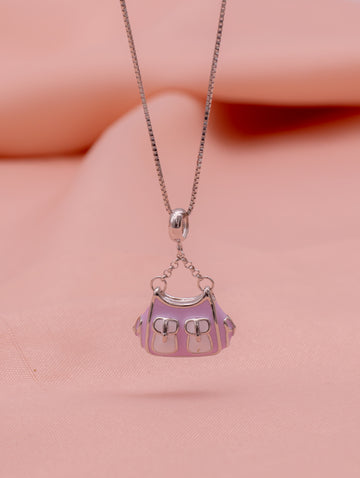 This stylish pendant showcases intricate enamel work in soft pastel shades of pink and white, designed in the shape of a chic handbag. Silver accents highlight the miniature pockets and handle, adding refined detailing to the playful design. Paired with a sleek box-link silver chain, this pendant is a trendy accessory perfect for fashion-forward individuals who love quirky yet elegant jewelry pieces.