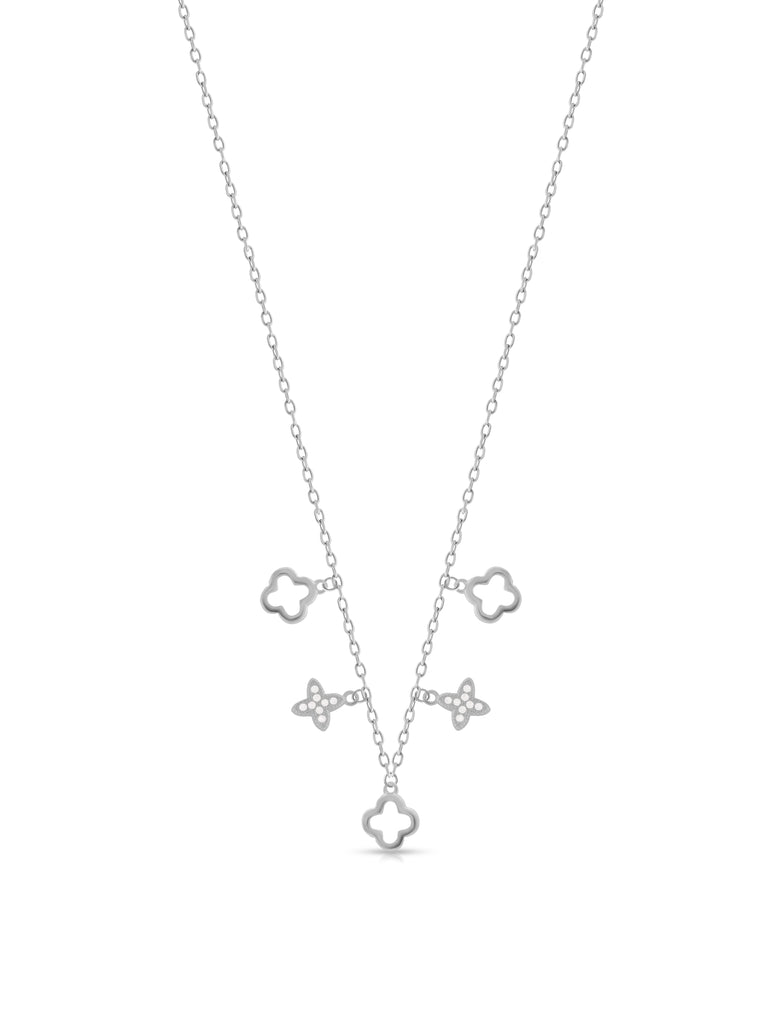 This elegant necklace features a fine silver chain adorned with alternating petite charms, including openwork quatrefoil shapes and sparkling pave-set clover motifs. The minimalist yet graceful design gives the piece a modern touch, while the shimmering Swarovski zircon stones add a hint of sparkle. Perfect for everyday wear or for layering with other jewelry, this necklace is a versatile accessory that complements any style.