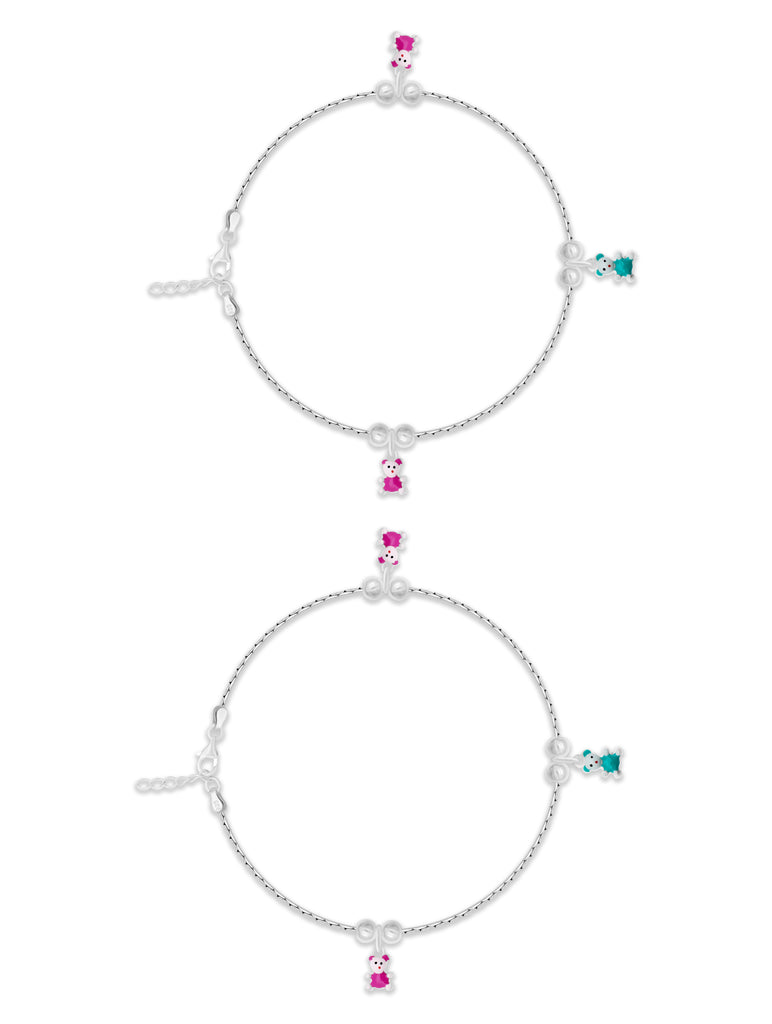 Charming and playful, this sterling silver anklet is adorned with delightful teddy bear-shaped enamel charms. Featuring two in sweet pastel pink and one in cheerful turquoise blue, the charms are evenly spaced along a fine textured silver chain with polished silver beads that add a subtle sparkle. Finished with an adjustable lobster clasp, this anklet is the perfect blend of fun and elegance for everyday wear.