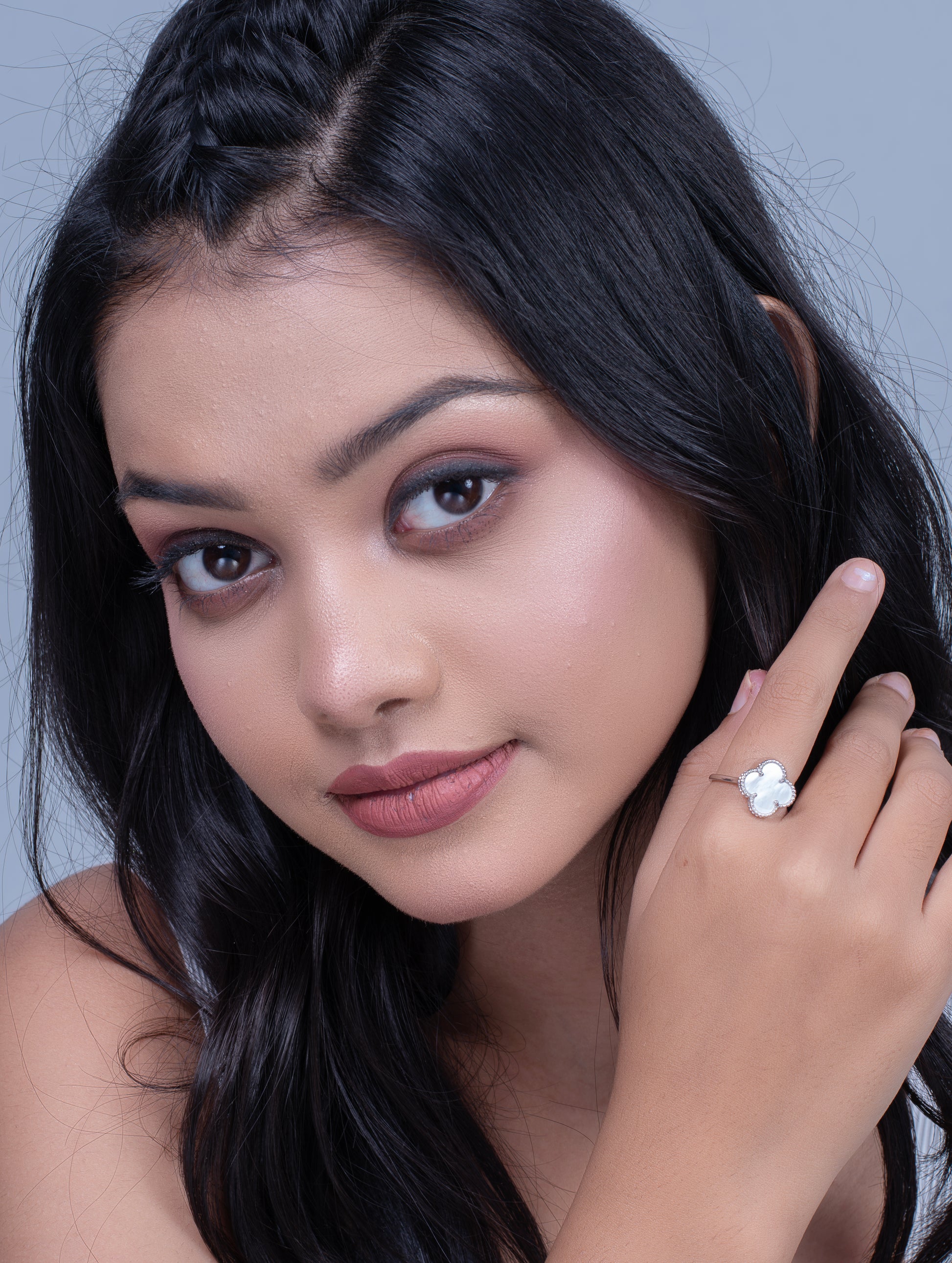 This elegant ring features a four-leaf clover or floral motif crafted in smooth, glossy white enamel, bordered with delicate beaded silver detailing. Its clean and subtle design offers a timeless look, making it versatile for everyday wear or as a unique accent for formal attire.